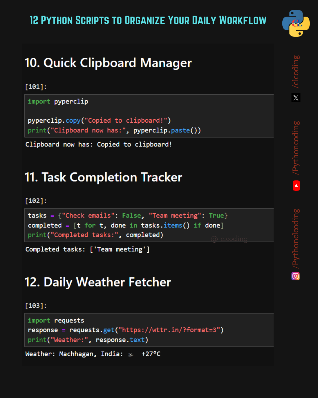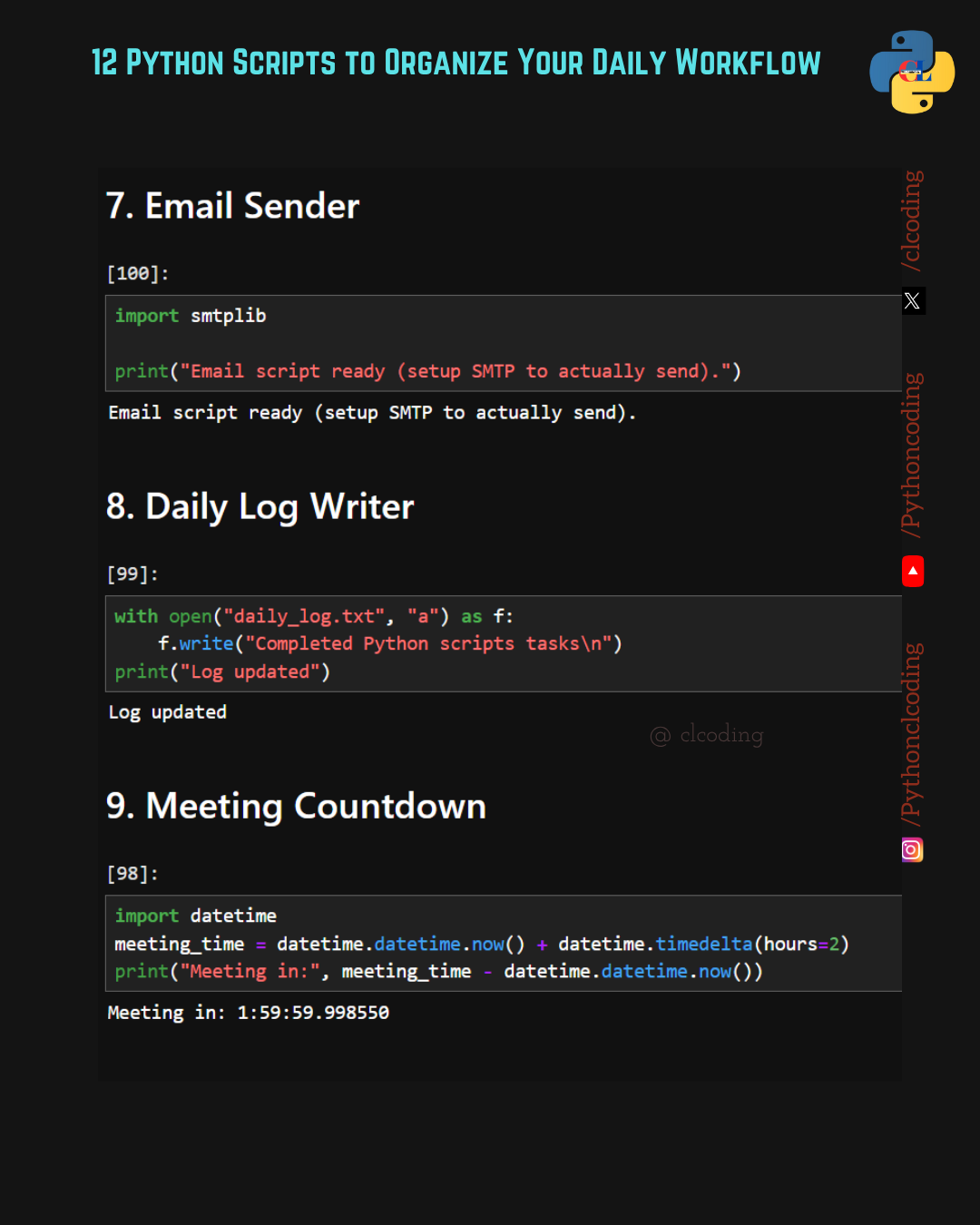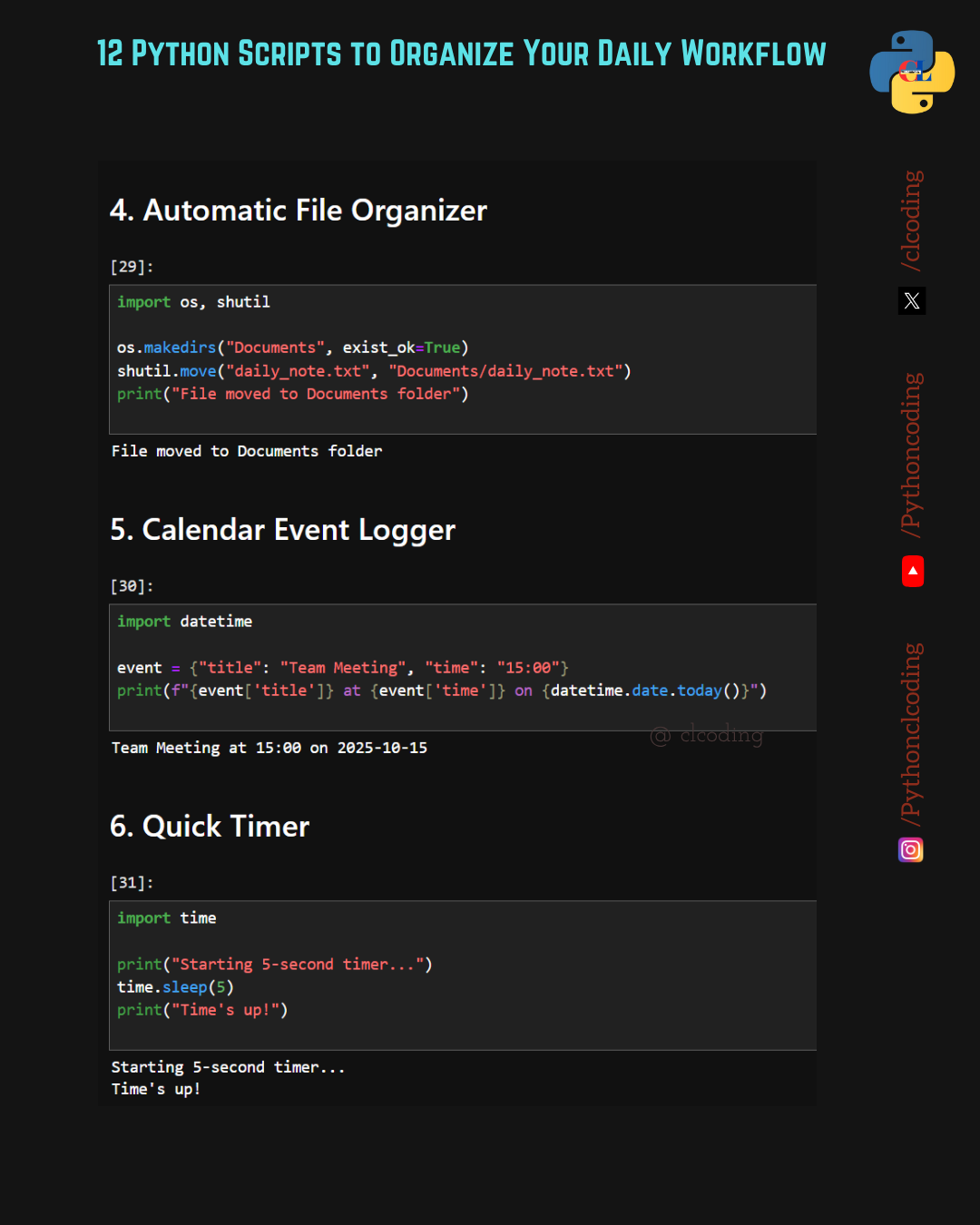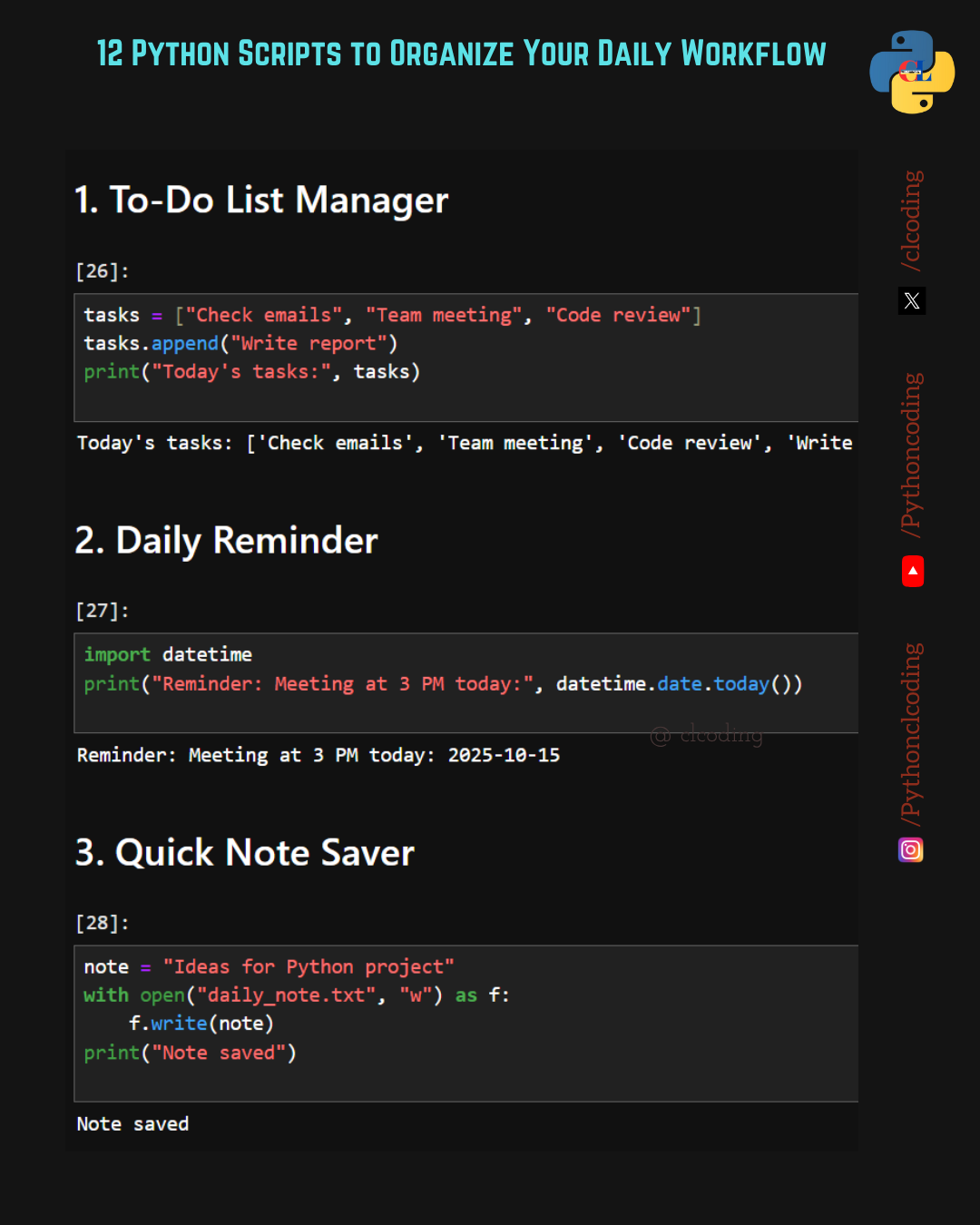 Managing daily tasks can feel overwhelming — but Python can help! With just a few lines of code, you can automate your workflow, boost productivity, and simplify your day. Here are 12 simple Python s
